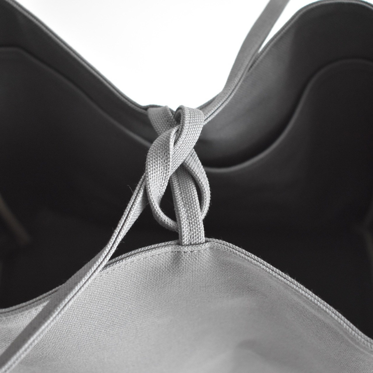 開口部を結ぶひも付きで、見た目にもさりげないアクセントを添えつつ、しっかりと荷物を守ってくれます。荷物を入れても沈まないよう、バッグの底は帆布を重ねて頑丈に作りました。