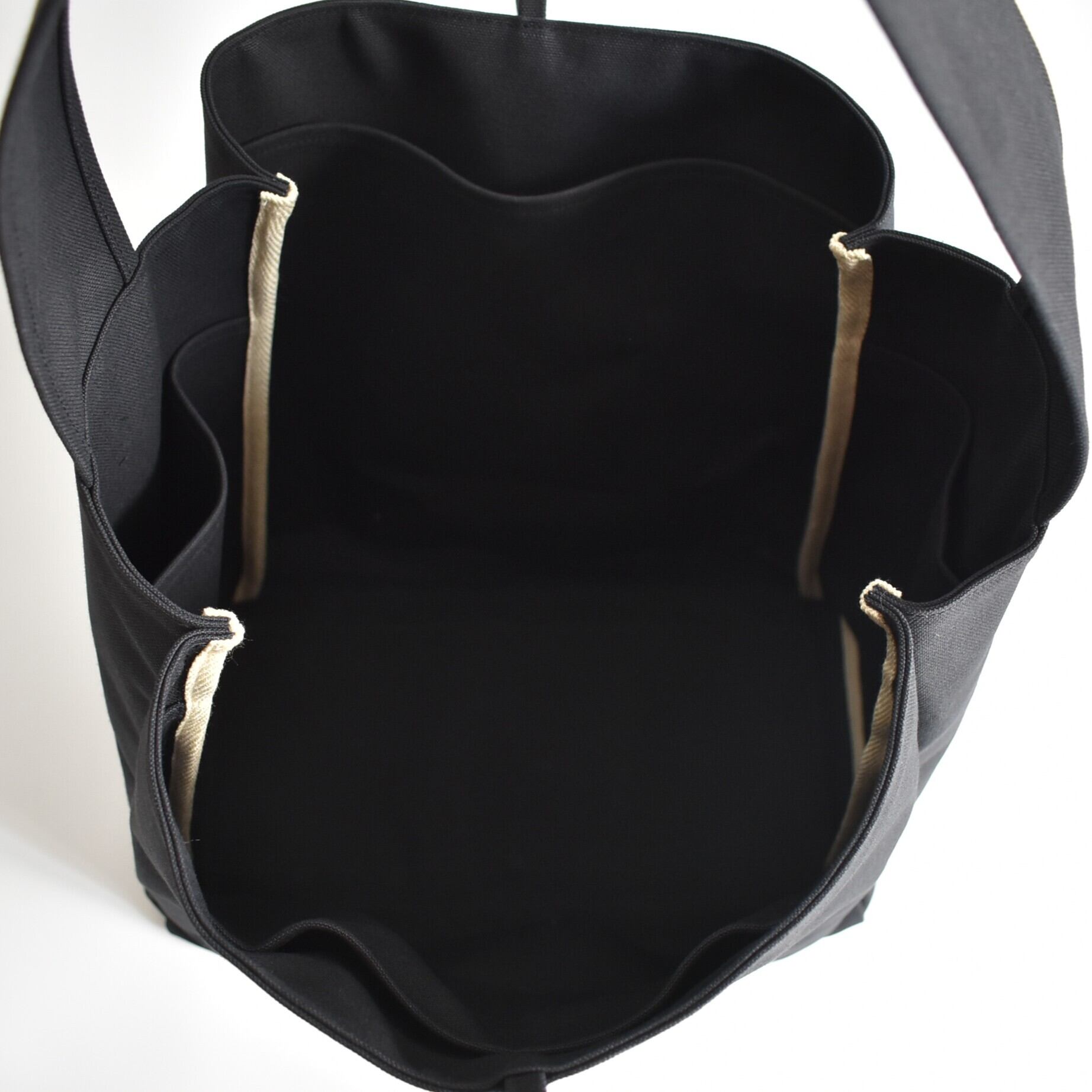開口部を結ぶひも付きで、見た目にもさりげないアクセントを添えつつ、しっかりと荷物を守ってくれます。荷物を入れても沈まないよう、バッグの底は帆布を重ねて頑丈に作りました。