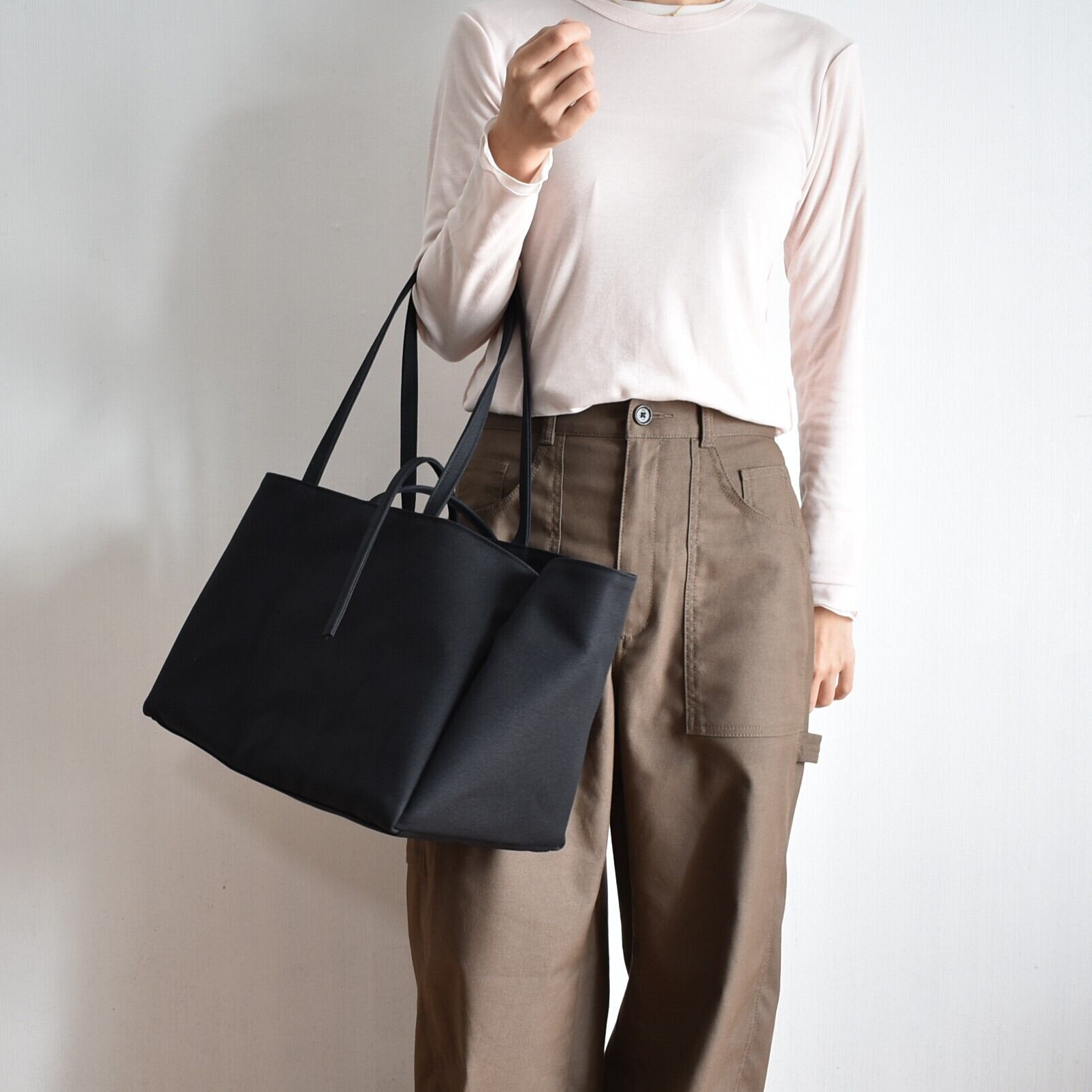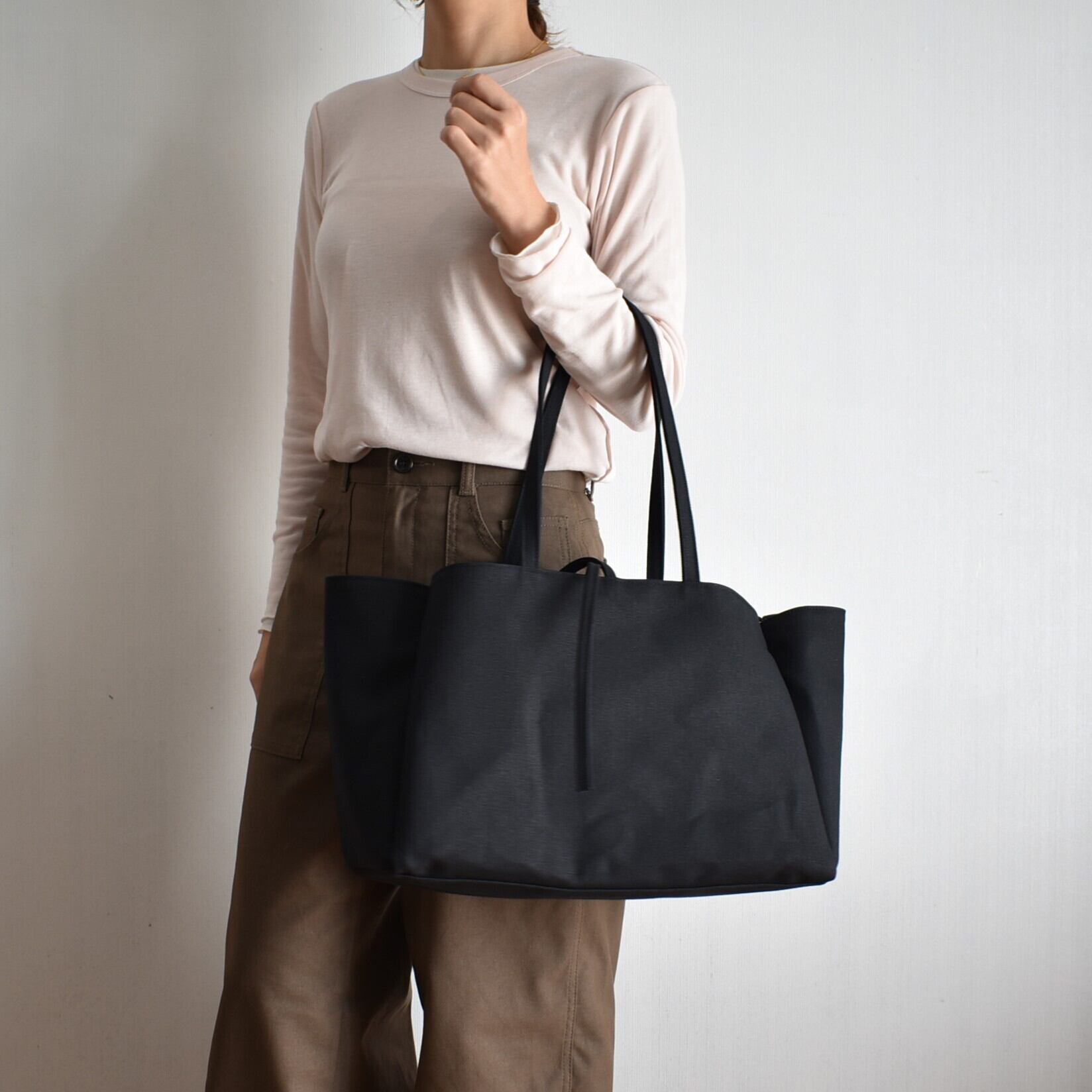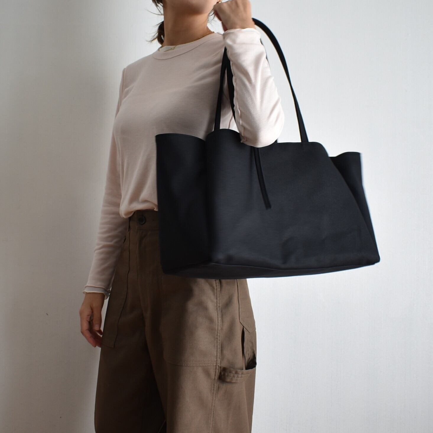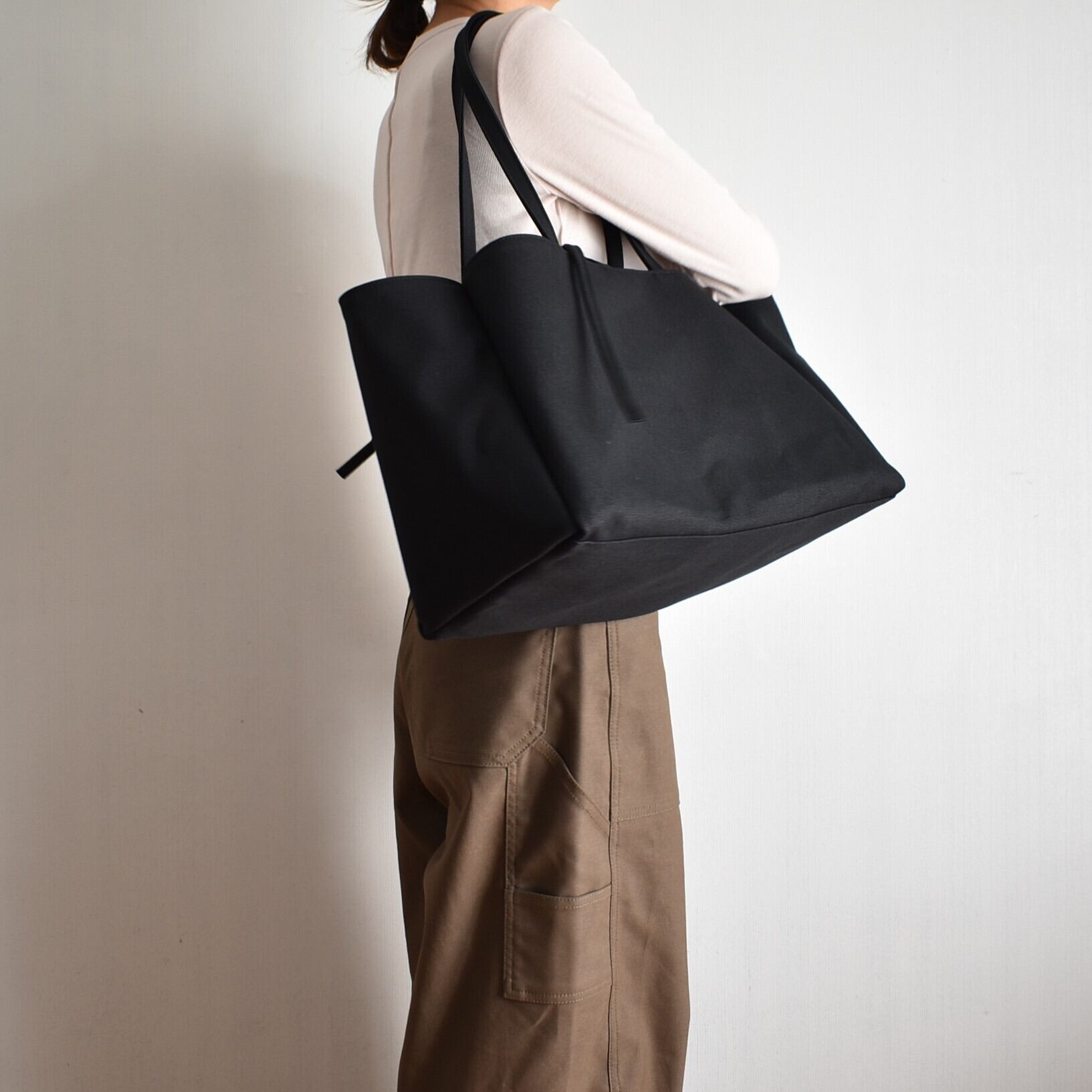 BOX TOTE BAGの持ち手を長くしたデザインのバッグです。