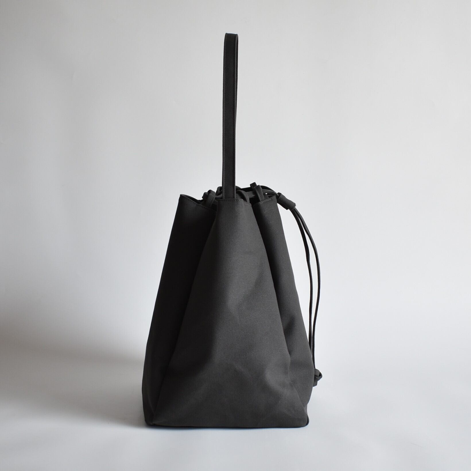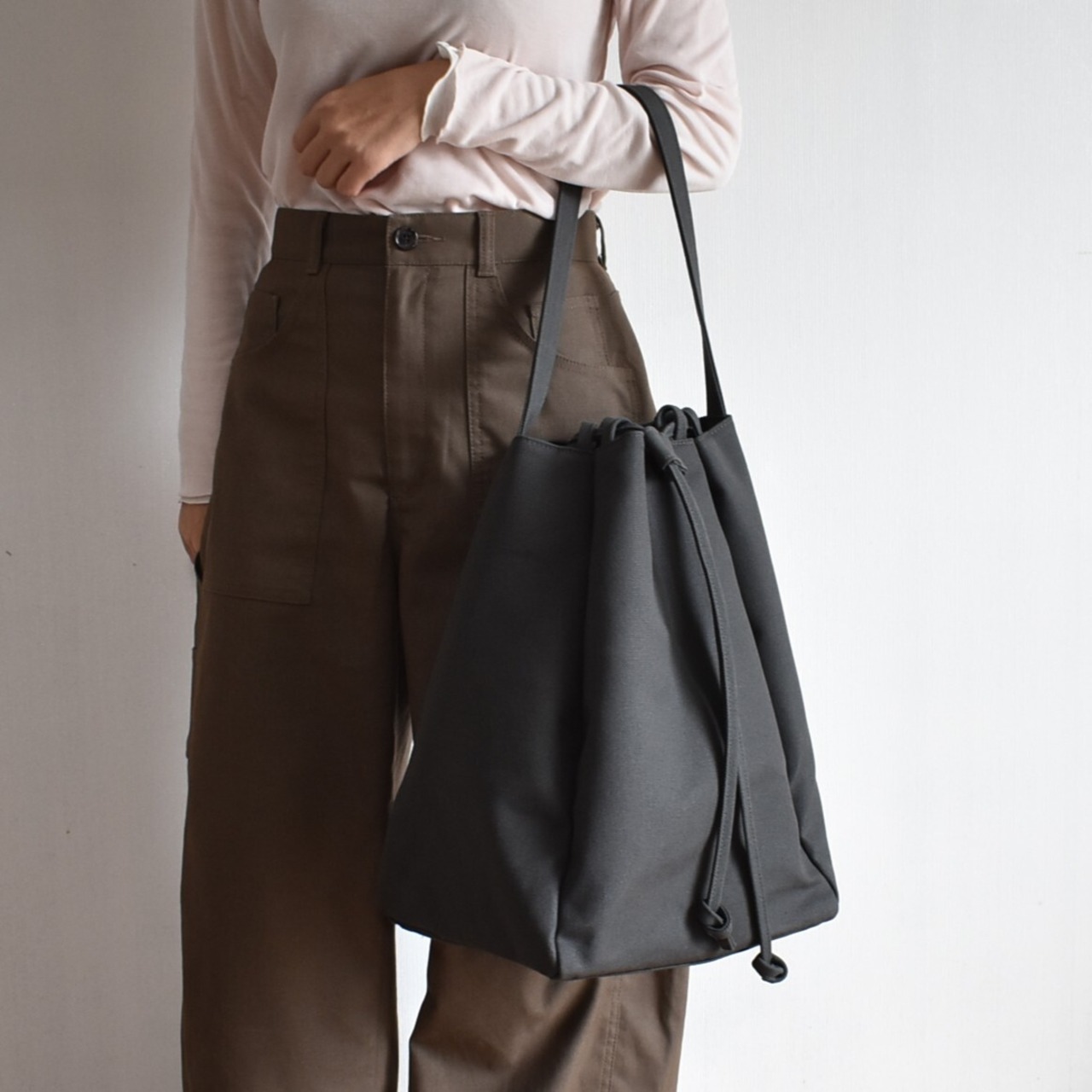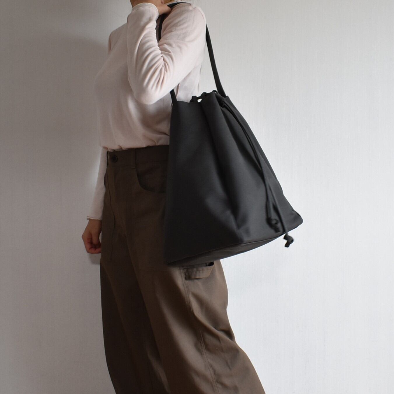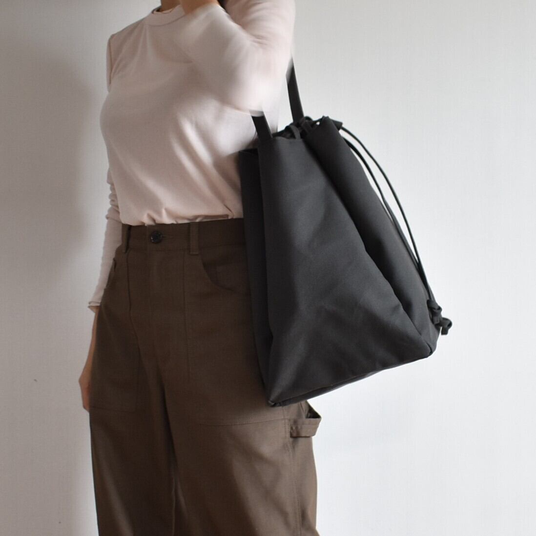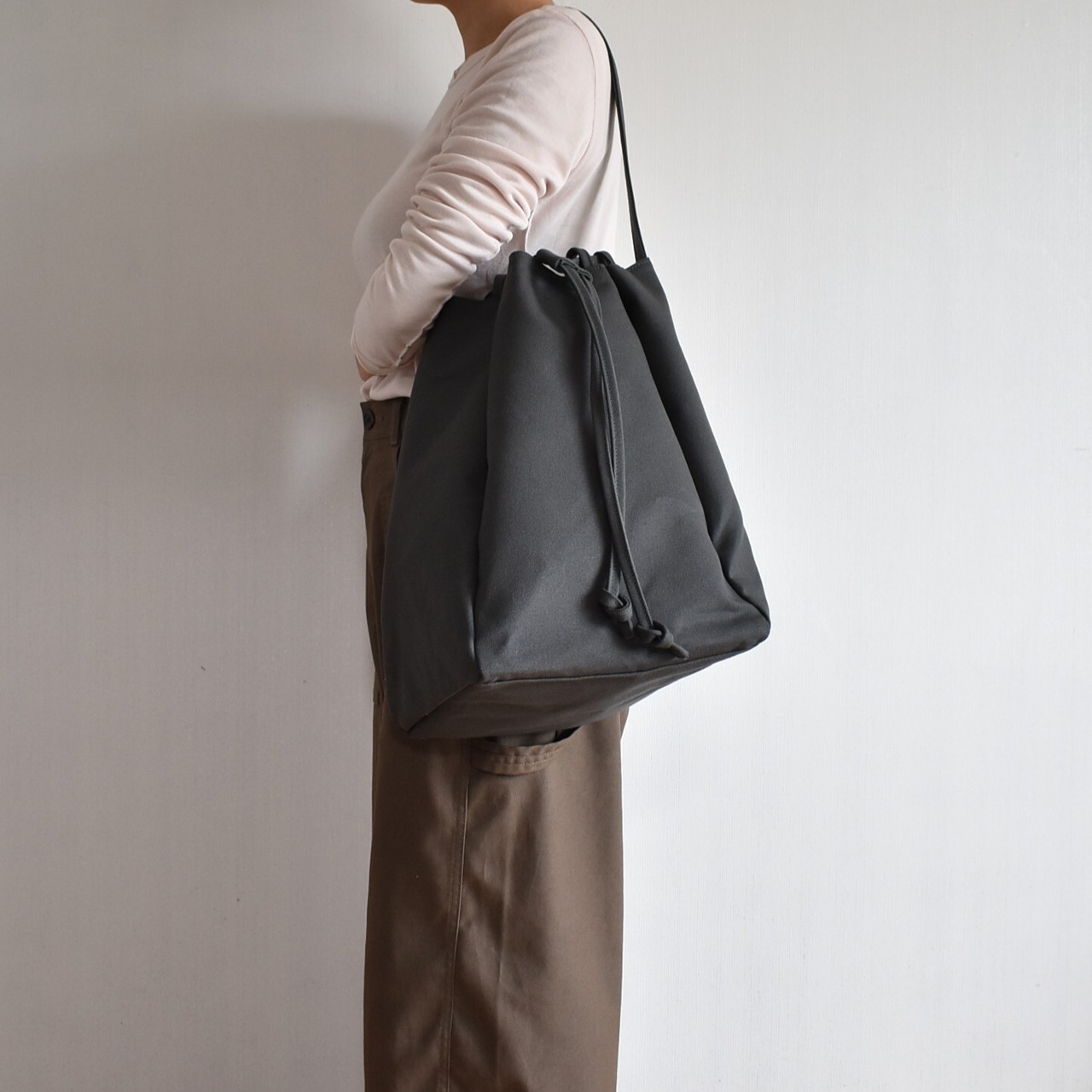 バッグの口元は、紐をスッと引くだけで瞬時にしっかりと閉まる巾着仕様。中身が見えたり飛び出したりする心配がなく、人混みや移動の際も安心です。機能的でありながら、巾着特有のふっくらとしたフォルムが、デザインのアクセントにもなっています。