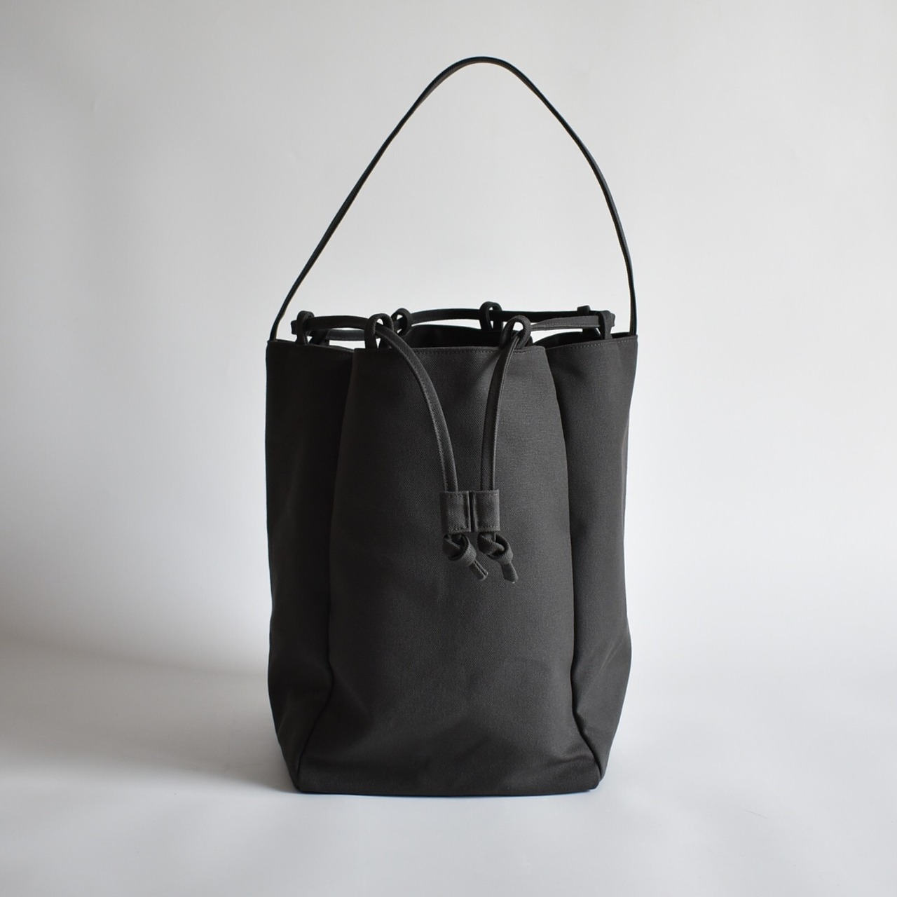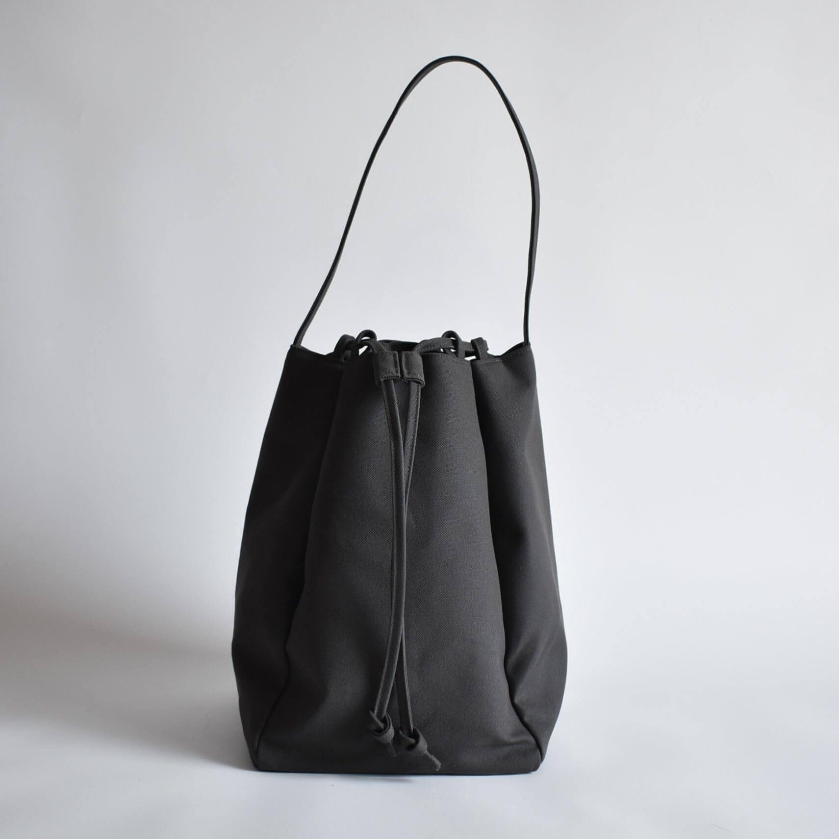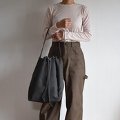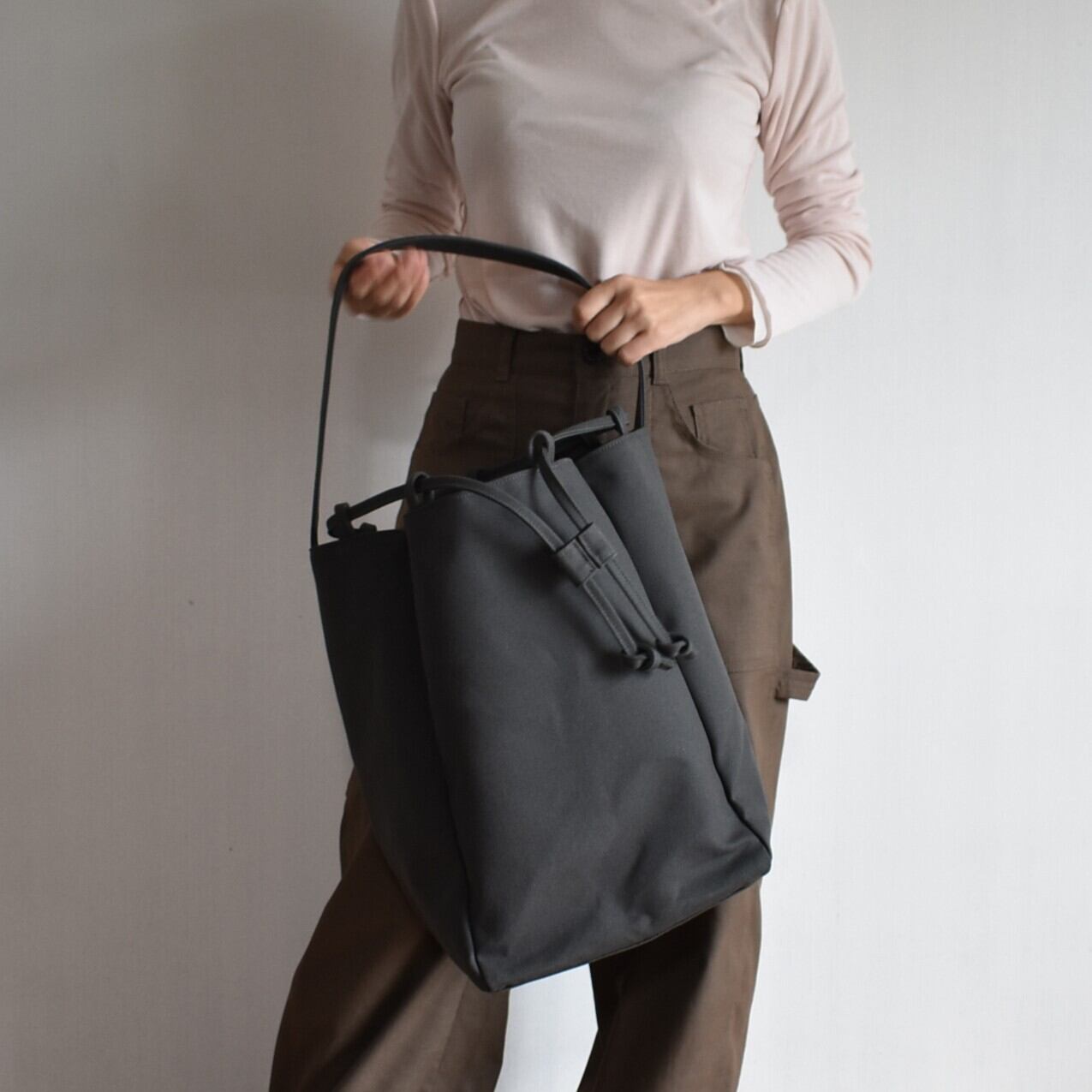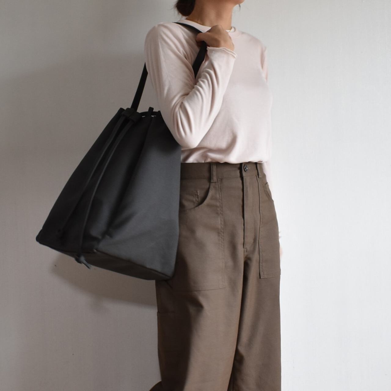 バッグの口元は、紐をスッと引くだけで瞬時にしっかりと閉まる巾着仕様。中身が見えたり飛び出したりする心配がなく、人混みや移動の際も安心です。機能的でありながら、巾着特有のふっくらとしたフォルムが、デザインのアクセントにもなっています。