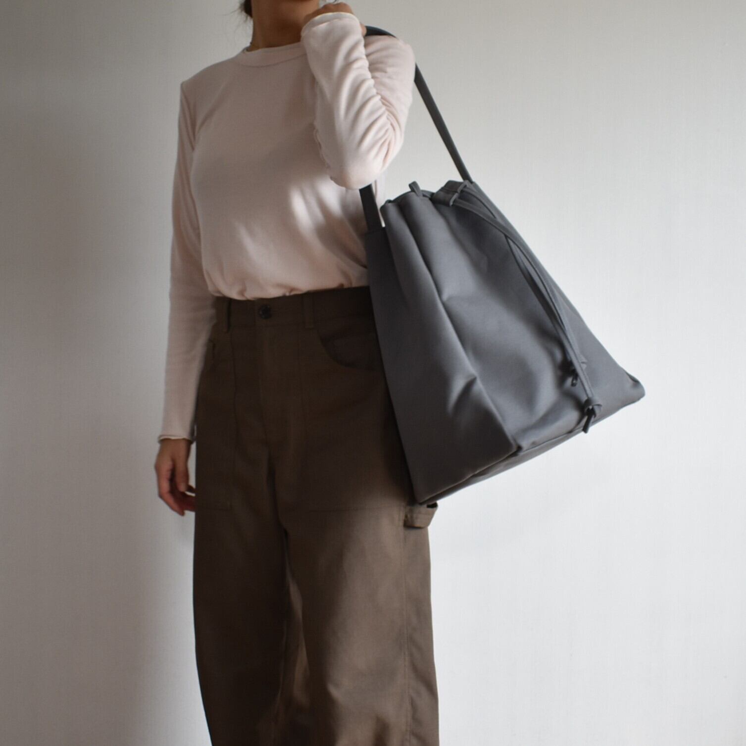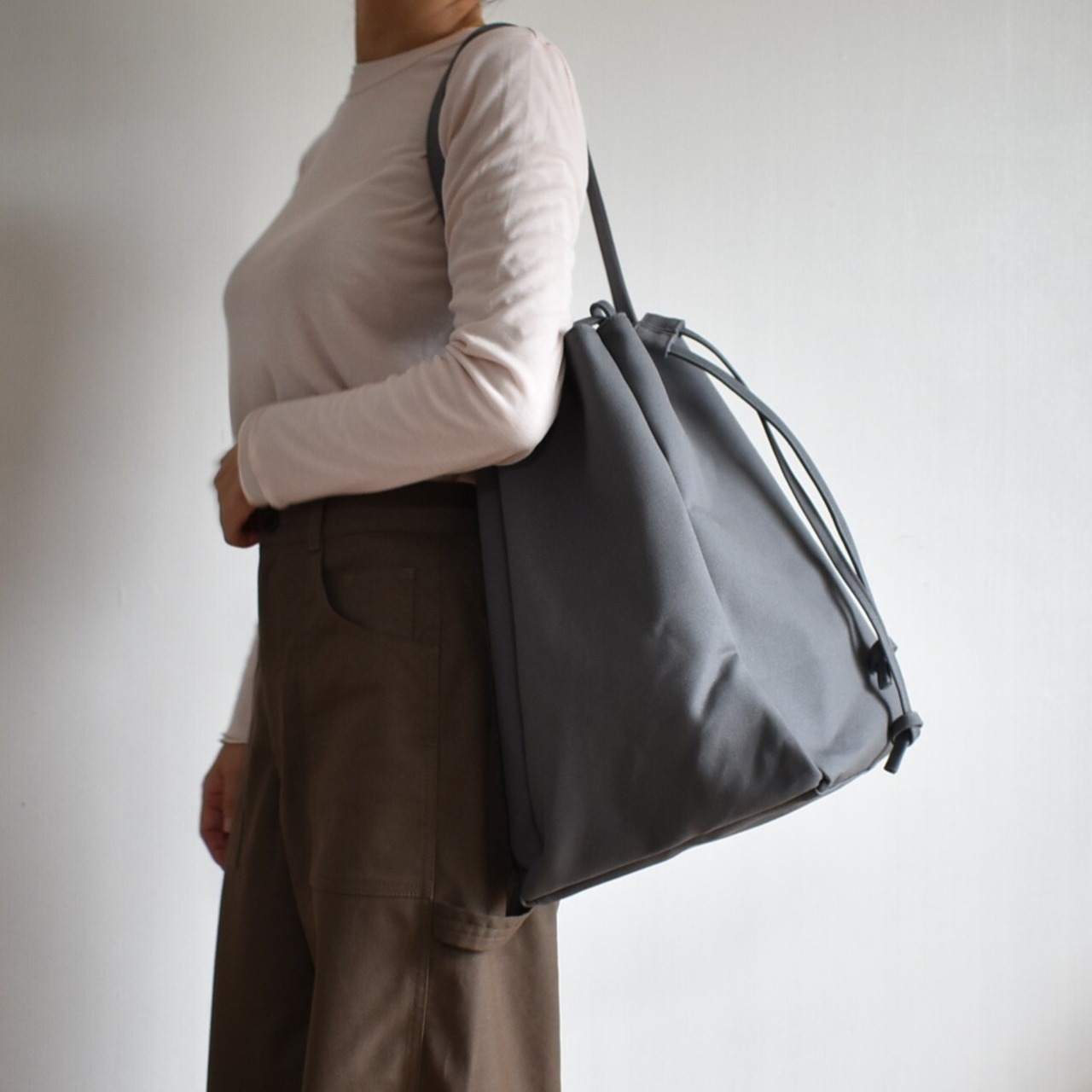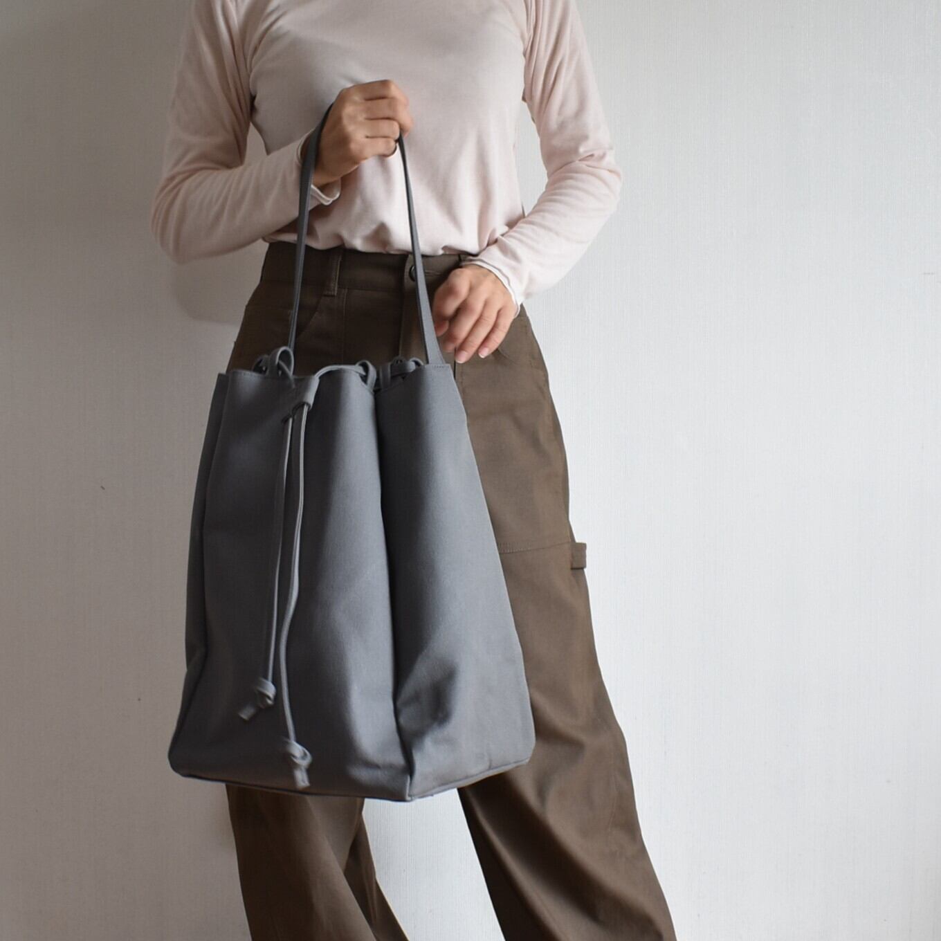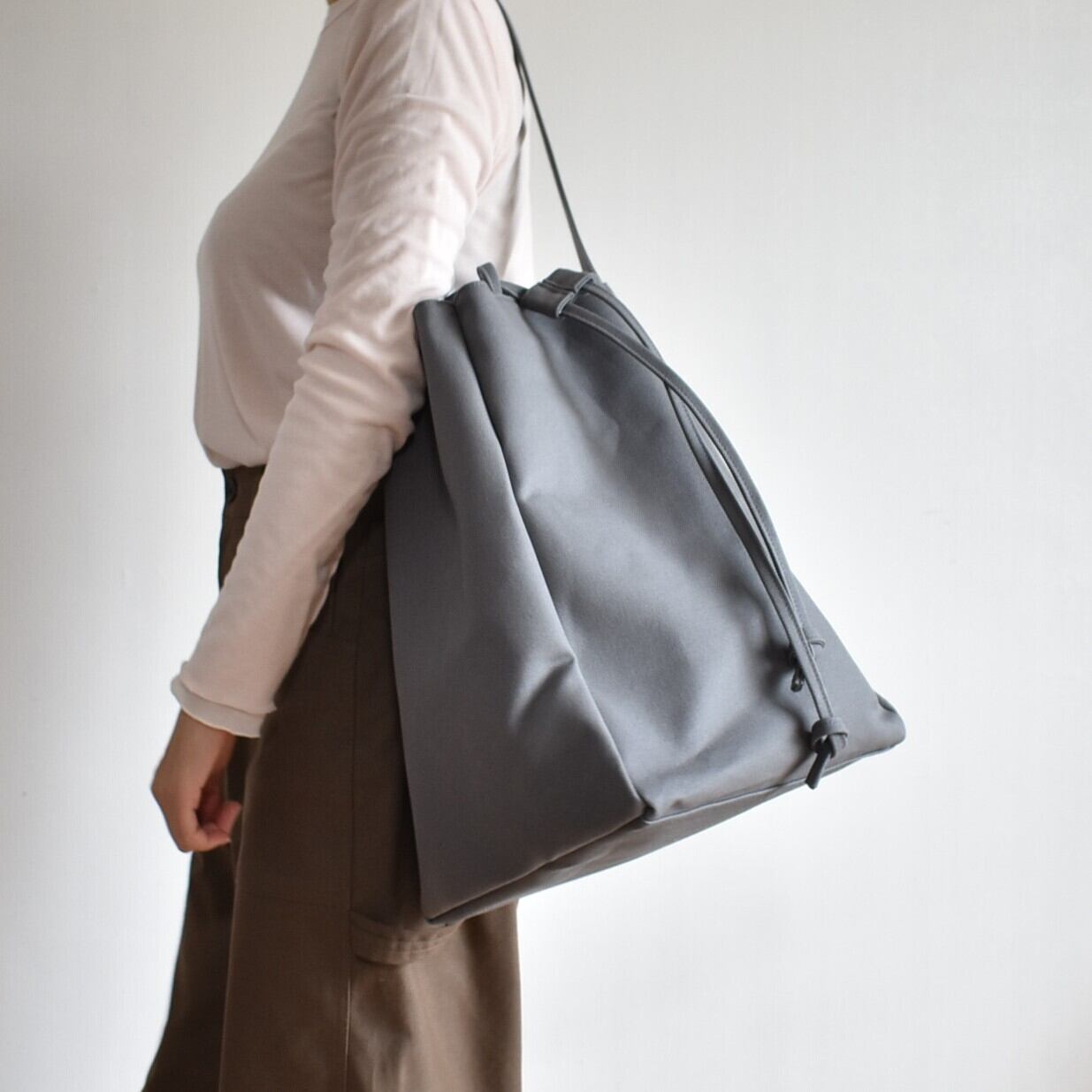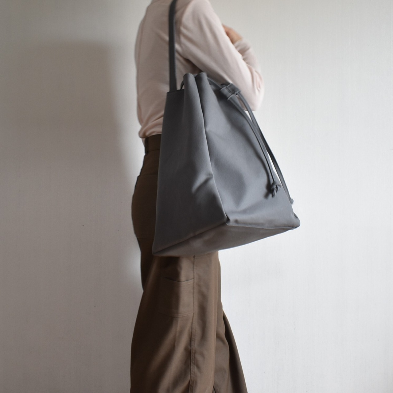 バッグの口元は、紐をスッと引くだけで瞬時にしっかりと閉まる巾着仕様。中身が見えたり飛び出したりする心配がなく、人混みや移動の際も安心です。機能的でありながら、巾着特有のふっくらとしたフォルムが、デザインのアクセントにもなっています。