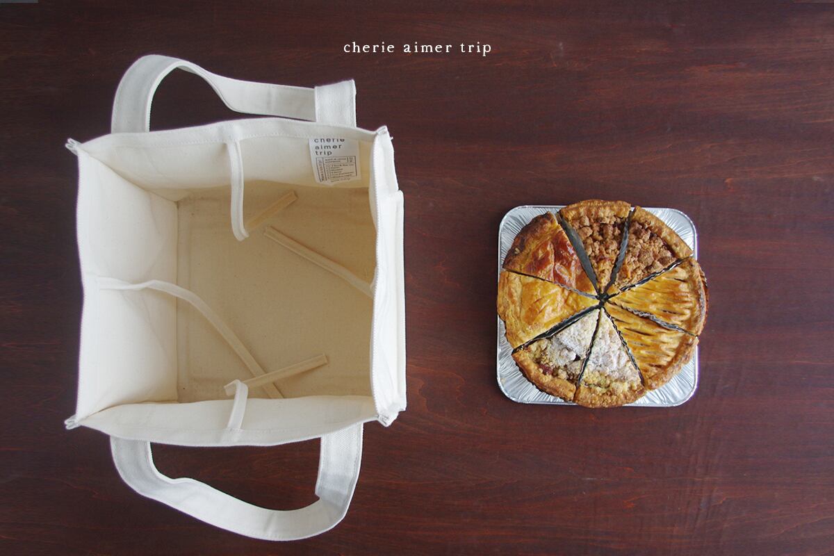 ほぼ正方形に作られたバッグは、ケーキ屋さんでホールケーキを買った時に貰った紙袋をモチーフに出来上がりました。