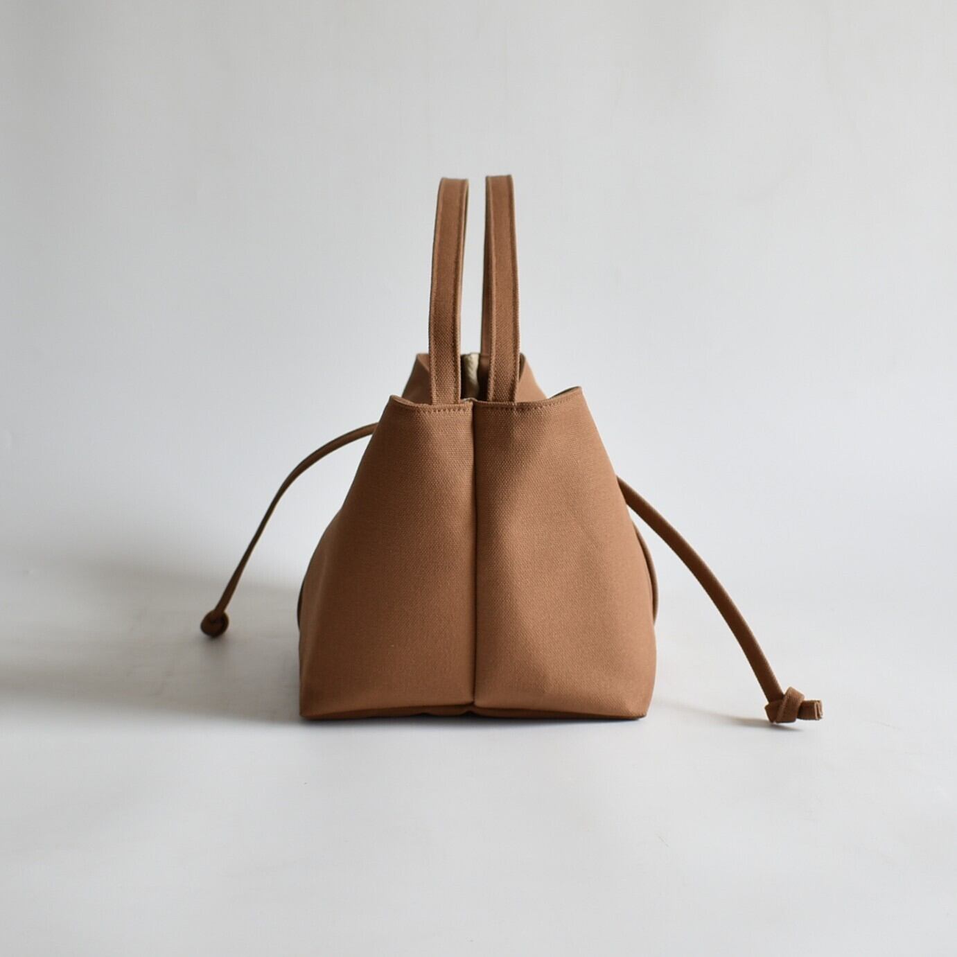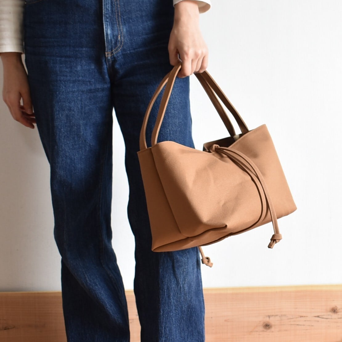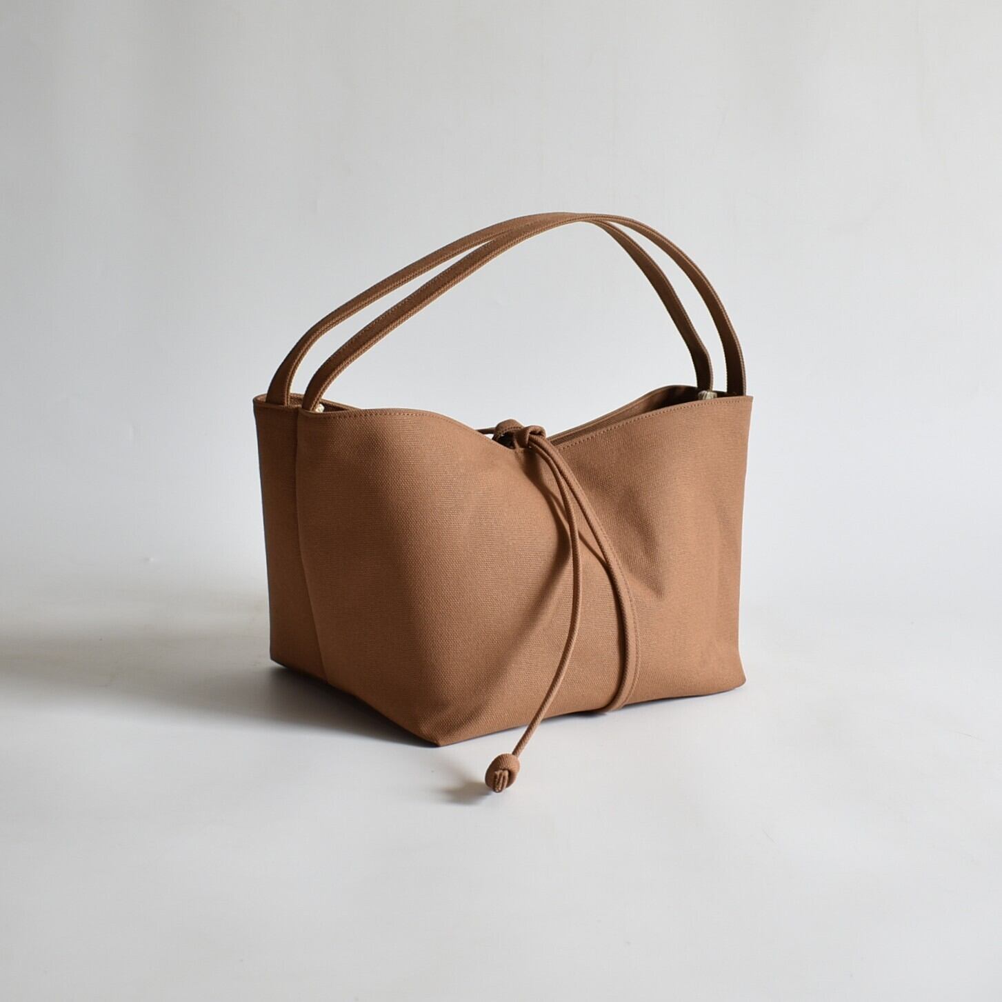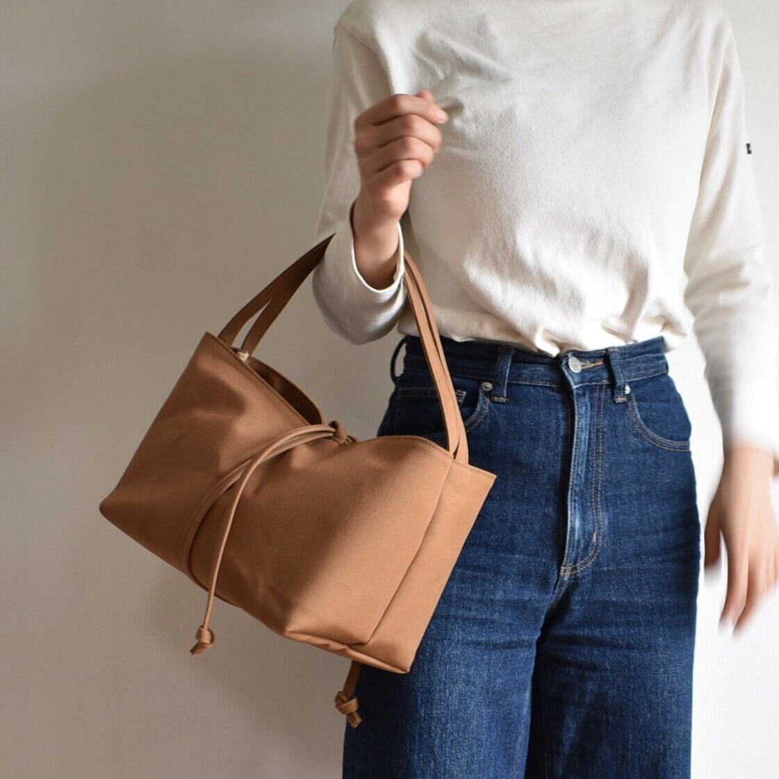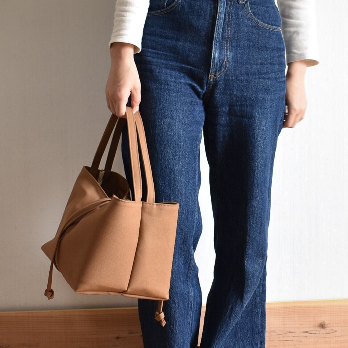 底からクロスした紐を引くことで、その瞬間に生まれる柔らかなギャザーとシルエットの変化を楽しむ。