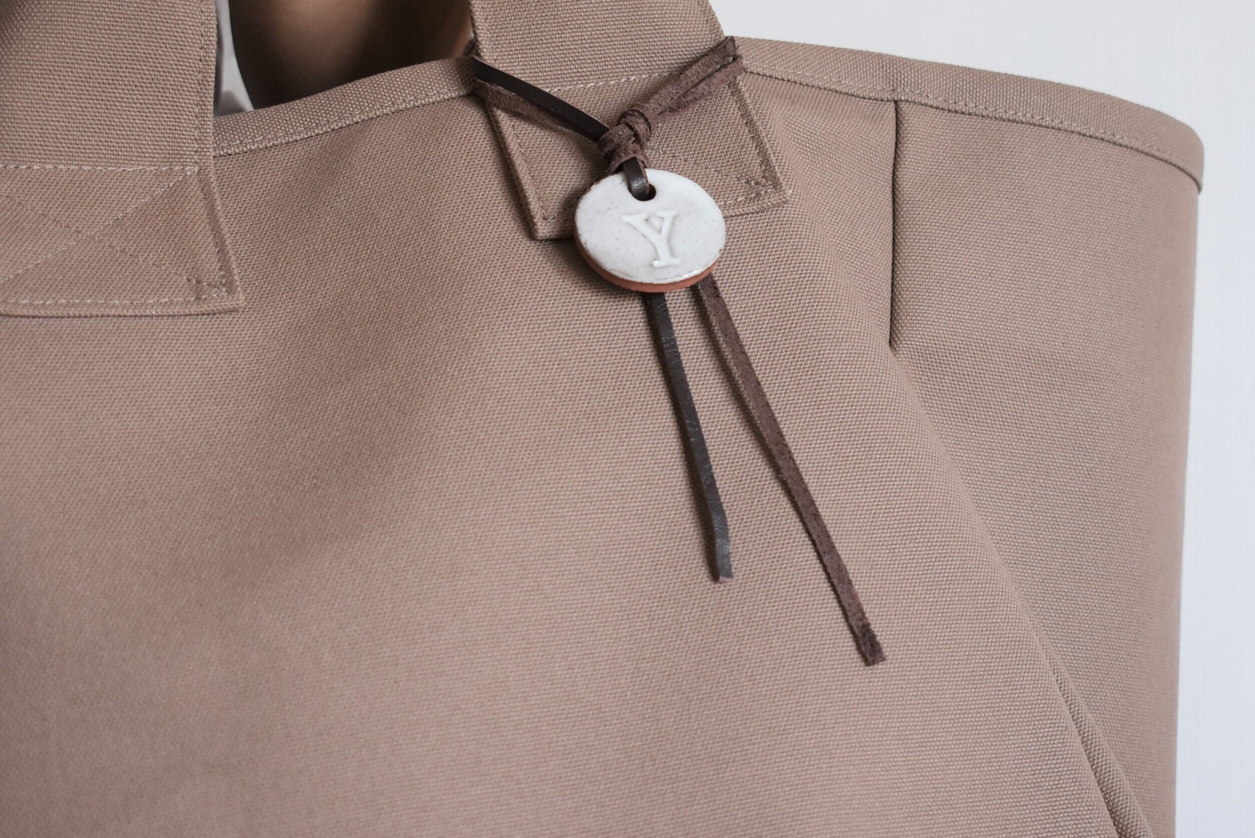 ・陶器のイニシャルタグに使用している紐かスエードの革紐となりますので、革クズ等がバッグに付着する場合がございます。気になる場合は、ブラシなどで軽く払うとキレイになります。