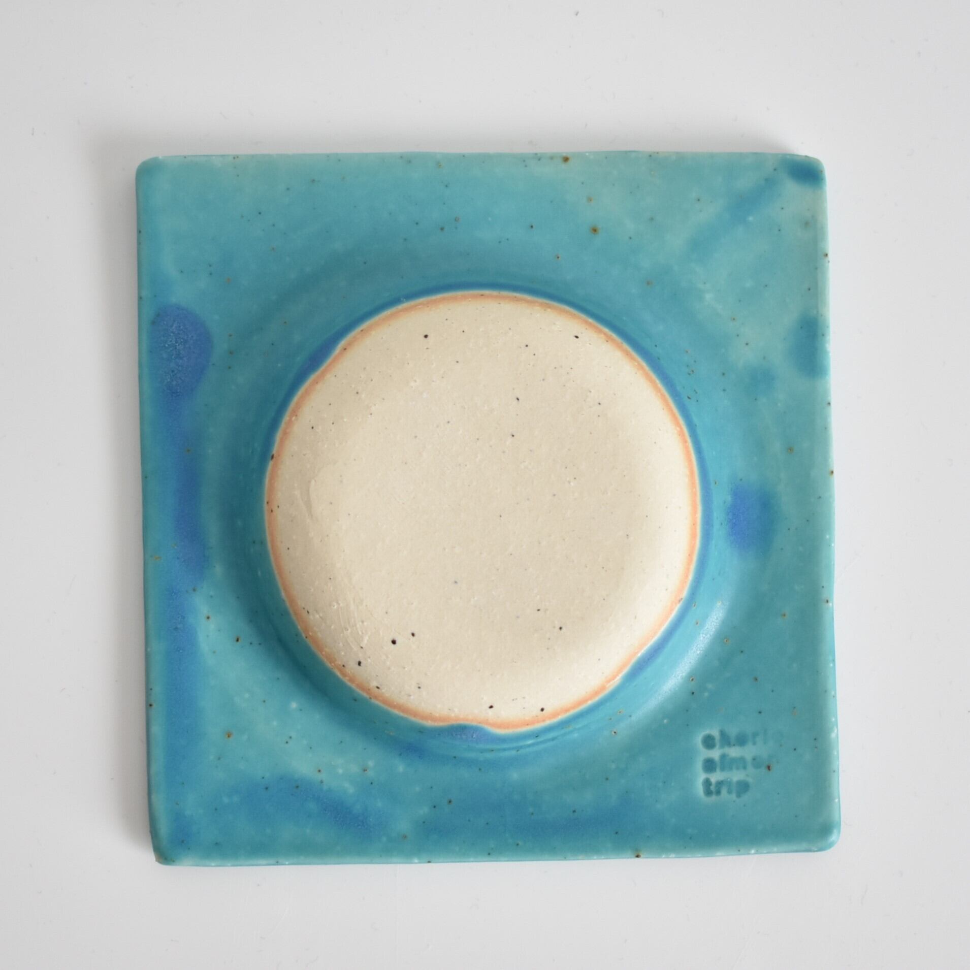 四角形リム付丸小皿 (トルコ/水色/青/マット/トルコブルー/点模様/白御影土)