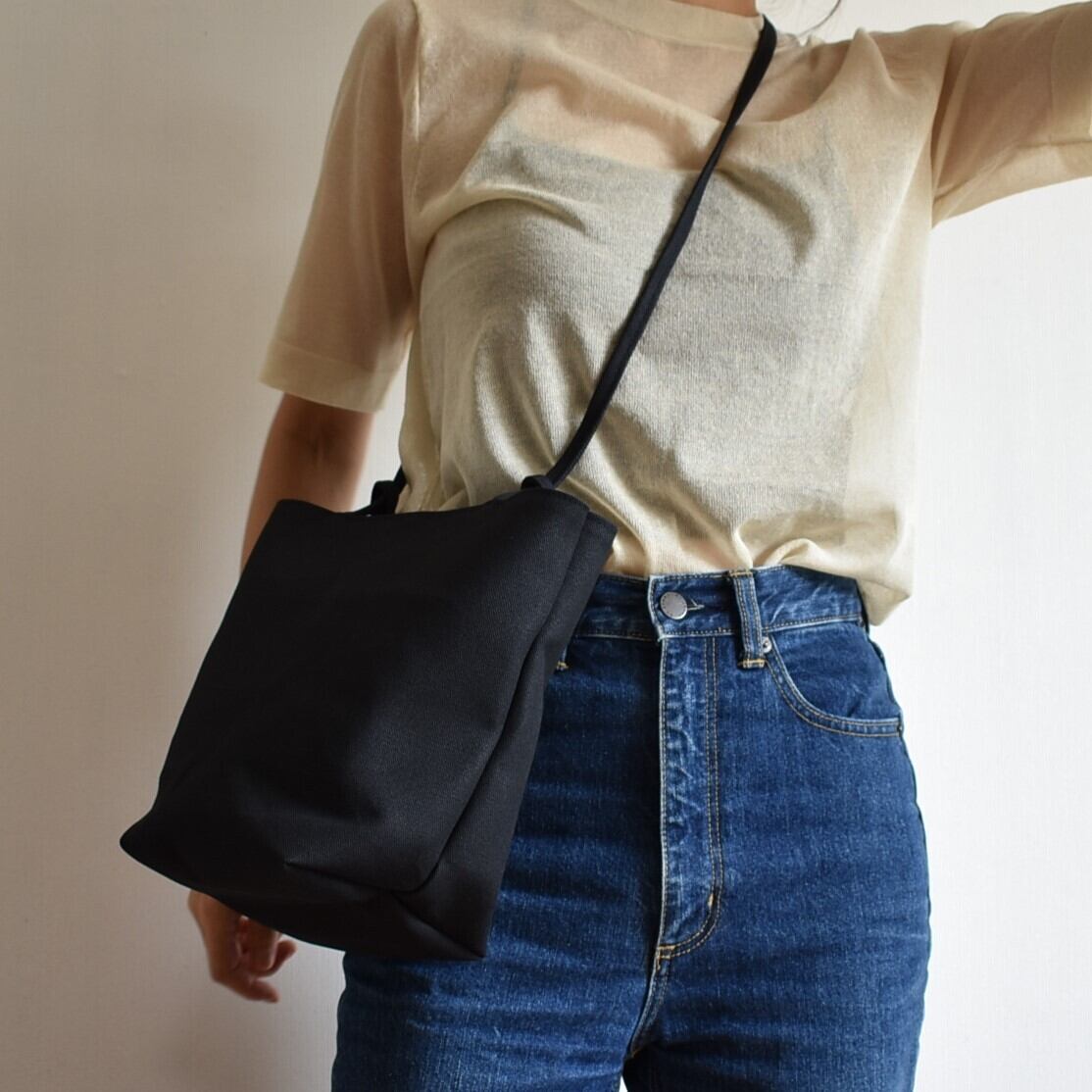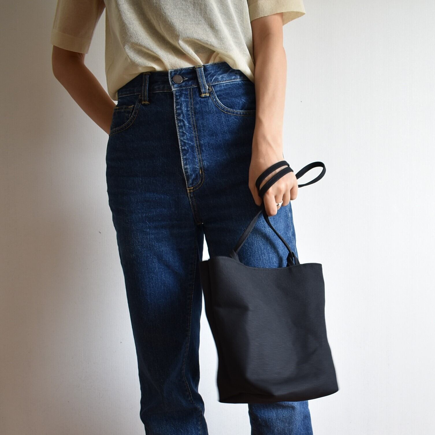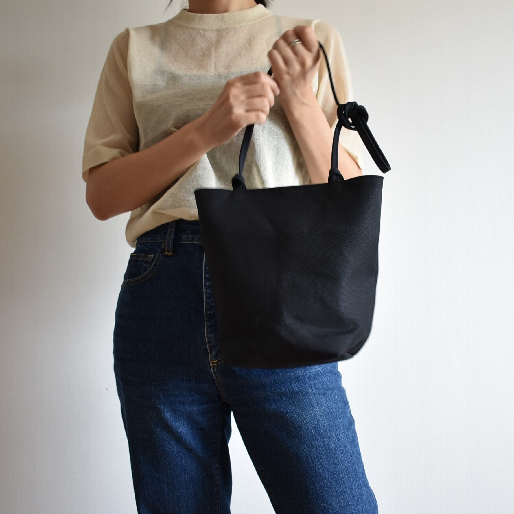 紐を結んで、自由に持ち方を選べるバッグです。