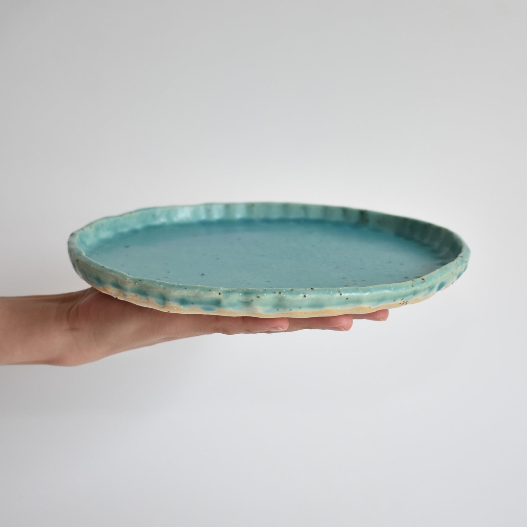 立体的な縁は敢えて揃えず手作りならではのナチュラルな風合いを活かした丸いフラットプレート皿です。